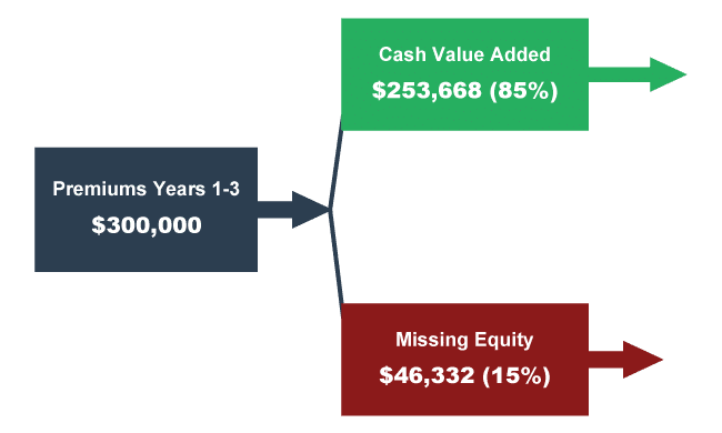 In this client’s case: $300K in premiums over 3 years, $253K made it into cash value. That means $46K “went missing.” And yeah — that sucks. Nobody likes that number.
