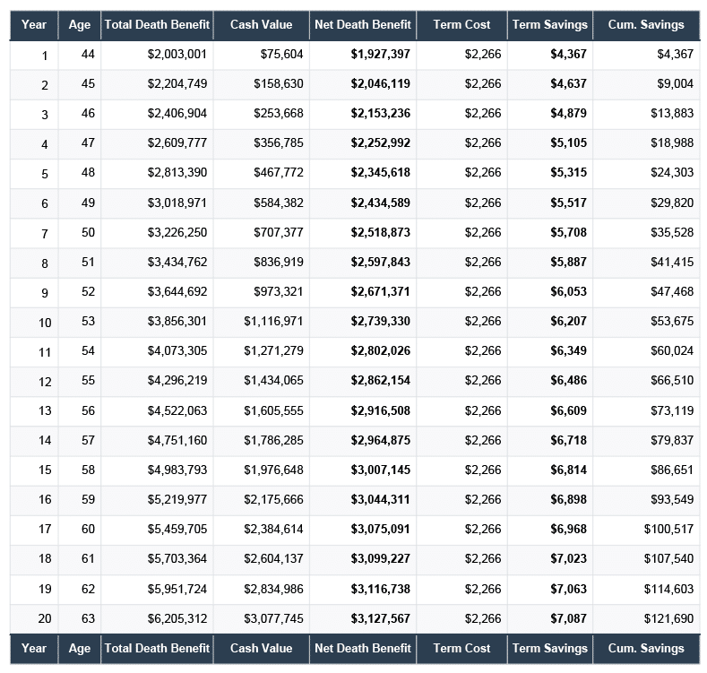 By having a properly-structured whole life policy, this client carries extra death benefit above and beyond his cash value. That net death benefit means he needs less term coverage. The policy effectively paid his term premiums for him. Over 20 years, that’s $121K in term he didn’t have to buy.