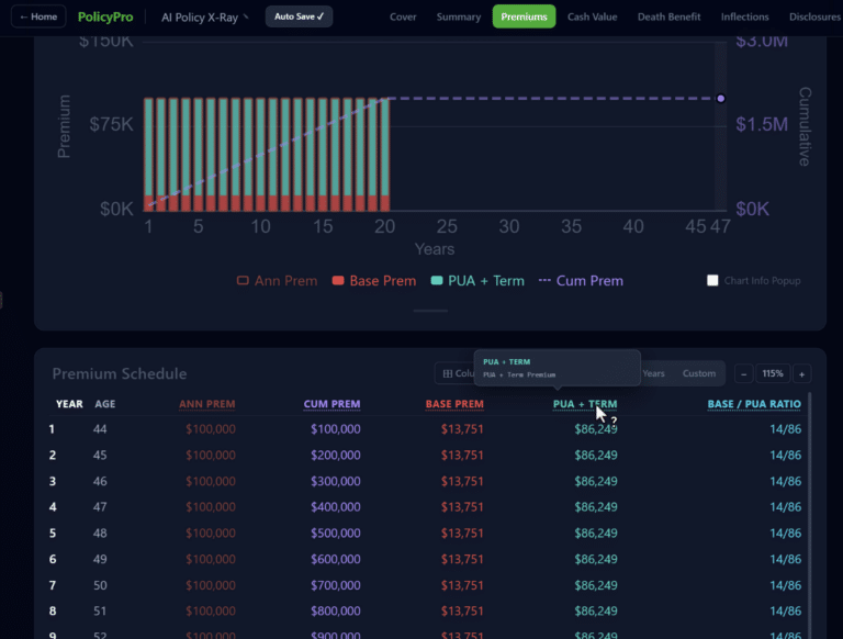 A lot of agents push the “10/90” policy — 10% base premium, 90% paid-up additions (PUAs) — as the magic ratio for maximum early cash.