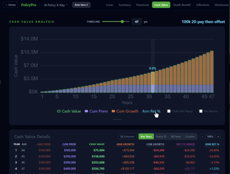 When you’re doing Infinite Banking — when you’re actually borrowing against the policy, repaying, borrowing again — you need to see year-over-year returns, not just a cumulative IRR. Because the timing of your borrowing matters. When the policy is negative in year one and then running at 4.5% tax-equivalent by year five, that changes how and when you use it.